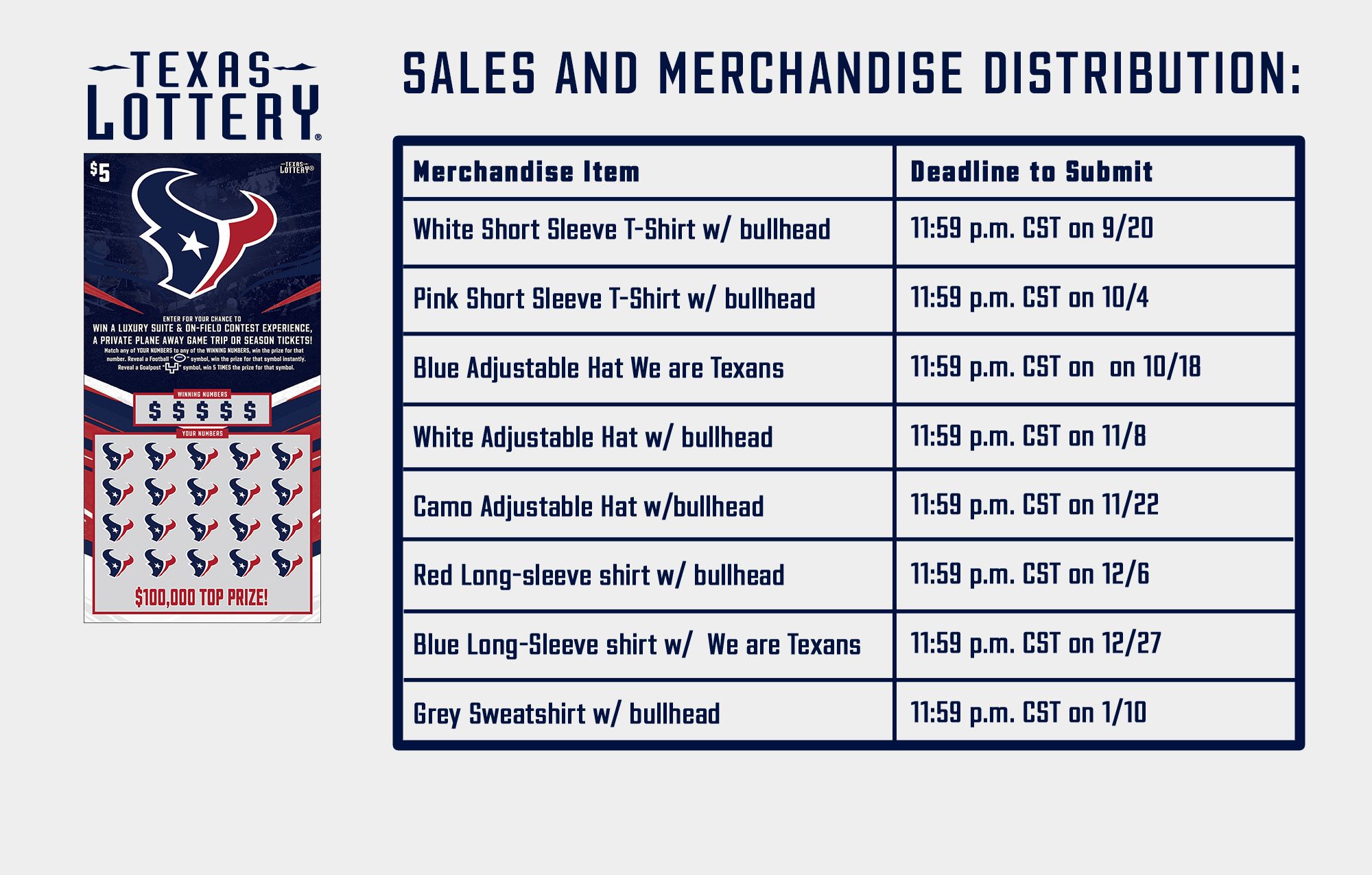 The newest version of the Houston Texans scratch-off game from the Texas Lottery is back with instant-win prizes up to 100000 and second-chance prizes perfect for any football fan. Order Online Tickets Tickets See Availability Directions. Texas Lottery - Play the Games of Texas.